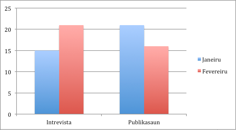 Iha fulan Fevereiru 2021 Intrevista hamutuk 21 ho peskizador sira FM nian no publikasaun hamutuk 16. Media nasional ne’ebé halo kovertura (Intervista no halo publikasaun maka hanesan Jornal Independente, Jornal Timor Post, Jornal Suara Timor Lorosa’e no Loluwari Media Online, Radio Komunidade no the Dili Weekly. Iha Janeiru 2021 Intrevista hamutuk 15 ho peskizador sira FM nian no publiksaun hamutuk 21. Media nasional ne’ebé halo kobertura (Intrevista no halo publikasaun) maka hanesan Jornal Independente, GMN-TV, Jornal Timor Post, Jornal Suara Timor Lorosa’e no Tempo Timor Online. Númeru entrevista no públikasaun iha fulan Jeneiru no Fevereiru 2021 ladun iha diferensia boot hanesan hatudu iha grafika kraik ne’e.